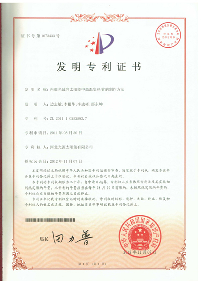 發明專利證書--內聚光減容太陽能中高溫集熱管的制作方法