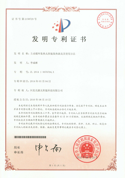 發明專利證書--主動循環集熱太陽能集熱器及其使用方法
