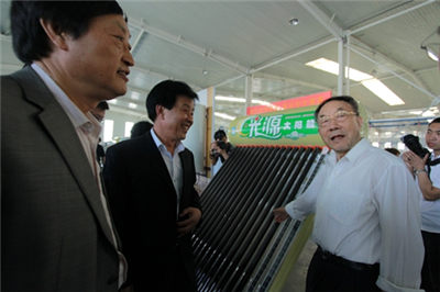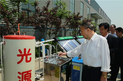 期間,視察團領導在公司董事長李成斌等陪同下,先后視察了公司五連鍍全自動真空管生產線、臥式環戊烷發泡水箱生產線、全自動產品組裝車間等國內一流生產線,視察了單機、壁掛等太陽能產品成品庫,同時認真聽取了公司副總邵東坤匯報的關于公司生產和經營環節的現狀,和公司發展規劃,詳細詢問了公司太陽能熱開水工程業務研究和開發現狀。